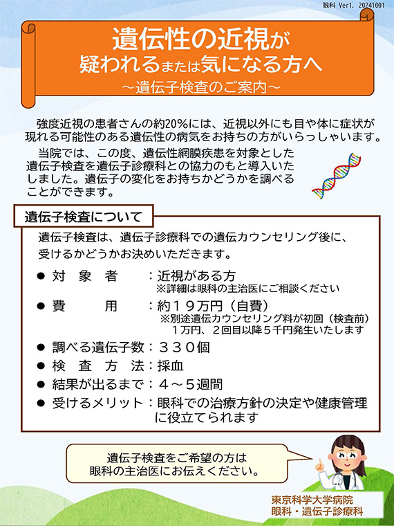 フィンガルリンク株式会社の遺伝性網膜疾患検査は、一度に330個の眼の病気を引き起こす遺伝子を調べることができ、強度近視の原因となっている眼の病気を見つけるために役立つ有用な遺伝学的検査です。この度、遺伝子診療科と協力して、この検査を実施することができるようになりました。遺伝子診療科では遺伝カウンセリングにより適切な情報提供を受けた後に検査の実施を決めることができます。