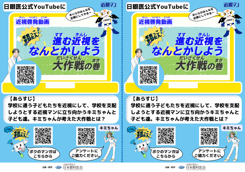 日本眼科医会から、近視予防のための子ども向けの動画や漫画が配信されております!クリニックで配布したり、学校や各家庭でデジタル端末の適正使用と屋外活動について、子どもたちと話し合うためにご活用ください!