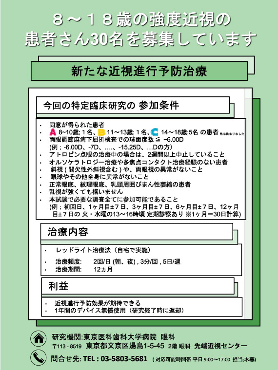 - 先端近視センター治療外来の予約が、眼科地域連携枠から独立して別枠で取得できるようになりました。